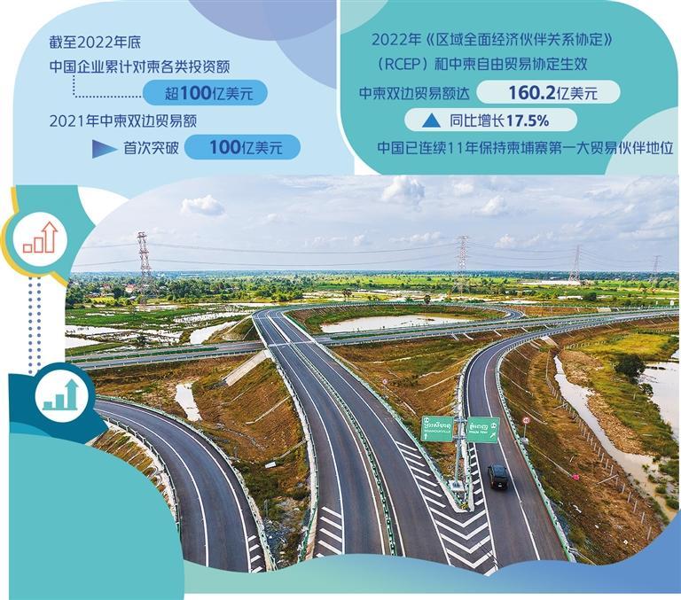 随着共建“一带一路”项目的开展,两国经贸关系迈上新台阶。中国是柬埔寨最大的外国直接投资来源国,截至2022年底,中国企业累计对柬各类投资额超过100亿美元。2021年中柬双边贸易额首次突破100亿美元关口,2022年随着《区域全面经济伙伴关系协定》(RCEP)和中柬自由贸易协定生效,中柬双边贸易额达到160.2亿美元,同比增长17.5%,中国已连续11年保持柬埔寨第一大贸易伙伴地位。中国已成为柬埔寨优质大米、新鲜香蕉、芒果的最主要出口市场,柬埔寨巴沙鱼、玉米、龙眼等农产品也相继完成输华程序,将陆续进入中国市场。