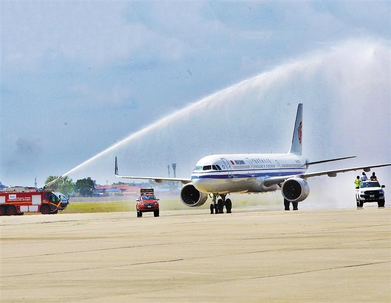 2月7日,国航航班在柬埔寨首都金边国际机场接受水门礼。 (新华社发)