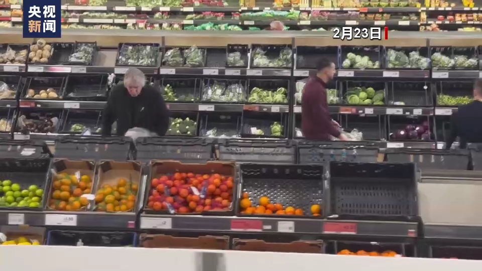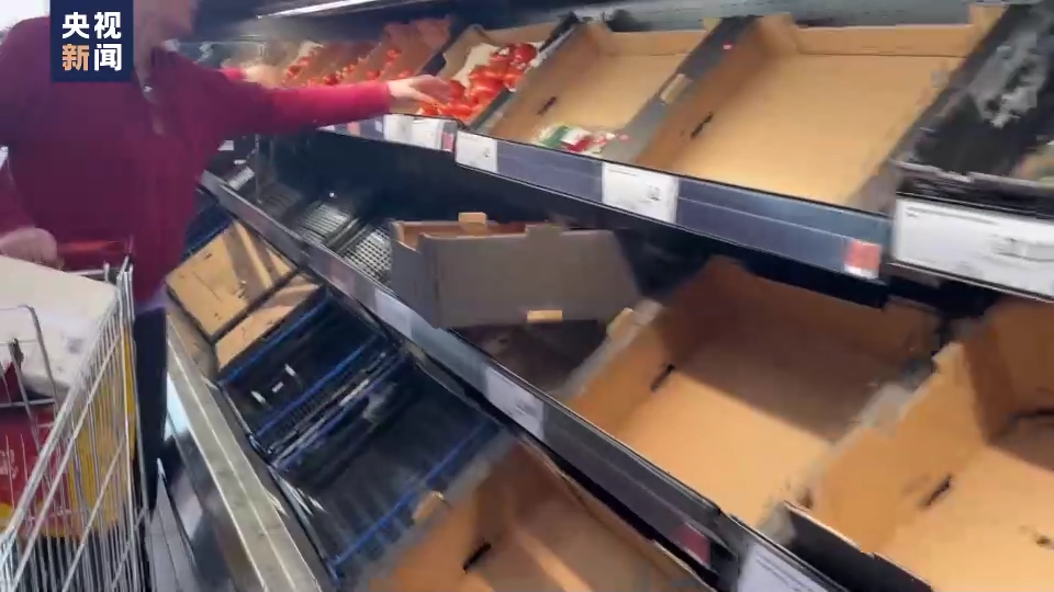 总台记者 陈林聪:隔了一天我们又来到了伦敦市中心的这家大型超市,可以看到西红柿的货架区原来有20多个品种,但是今天我们看到只剩下四五个品种为数不多的西红柿。但是其他货品例如黄瓜和辣椒的供应情况还是正常的。