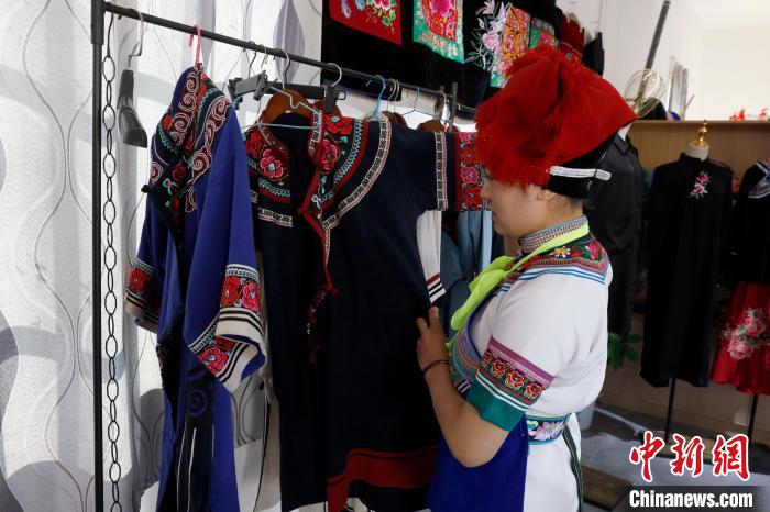 资料图为白沙坡村绣娘整理彝绣产品。李嘉娴摄