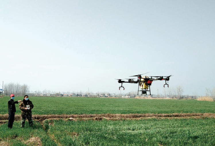 记者在现场看到,数台无人机沿着田块作低空飞翔,发出“嗡嗡”声响,匀速地飞洒着药液,不一会儿,便完成一整片麦田的除草作业。