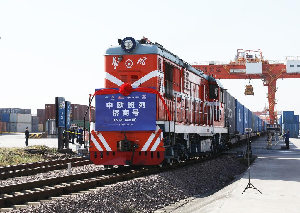 2021年11月23日,满载着100个标箱的“侨商号”中欧(义新欧)班列从铁路义乌西站出发,驶向西班牙首都马德里。