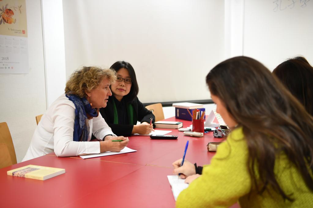 2018年11月13日,在西班牙南部小城格拉纳达,雷林科教授(左一)在格拉纳达大学孔子学院参加教学工作会议。