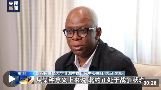 约翰内斯堡大学非洲中国研究中心主任 大卫·蒙耶:最令人担心的主要是北约正在扩张。从某种意义来说,北约正处于战争状态,它向乌克兰提供更多武器,导致冲突持续。这对解决问题没有任何帮助,只能通过和平方式解决俄乌冲突,应避免北约继续扩大。