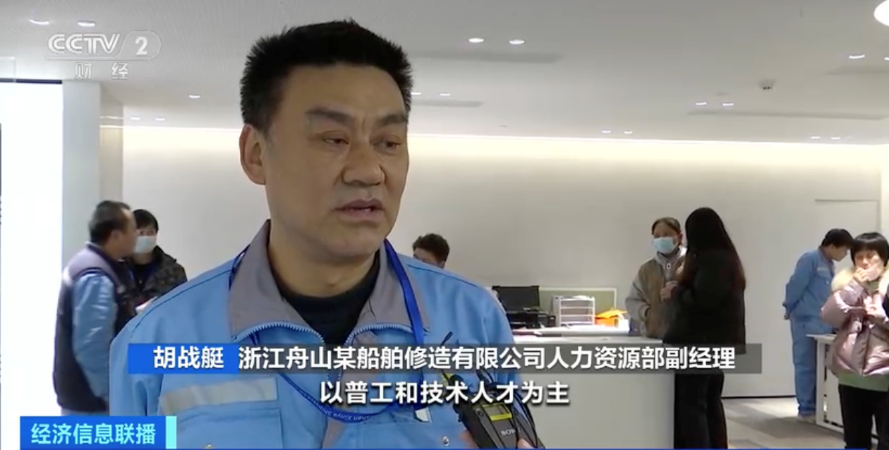 浙江舟山某船舶修造有限公司人力资源部副经理 胡战艇:目前缺口大概100人左右,以普工和技术人才为主。