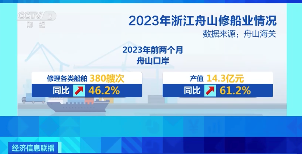 根据舟山海关统计,今年前两个月,舟山口岸共计修理各类船舶380艘次,产值达14.3亿元,同比分别增长46.2%和61.2%。