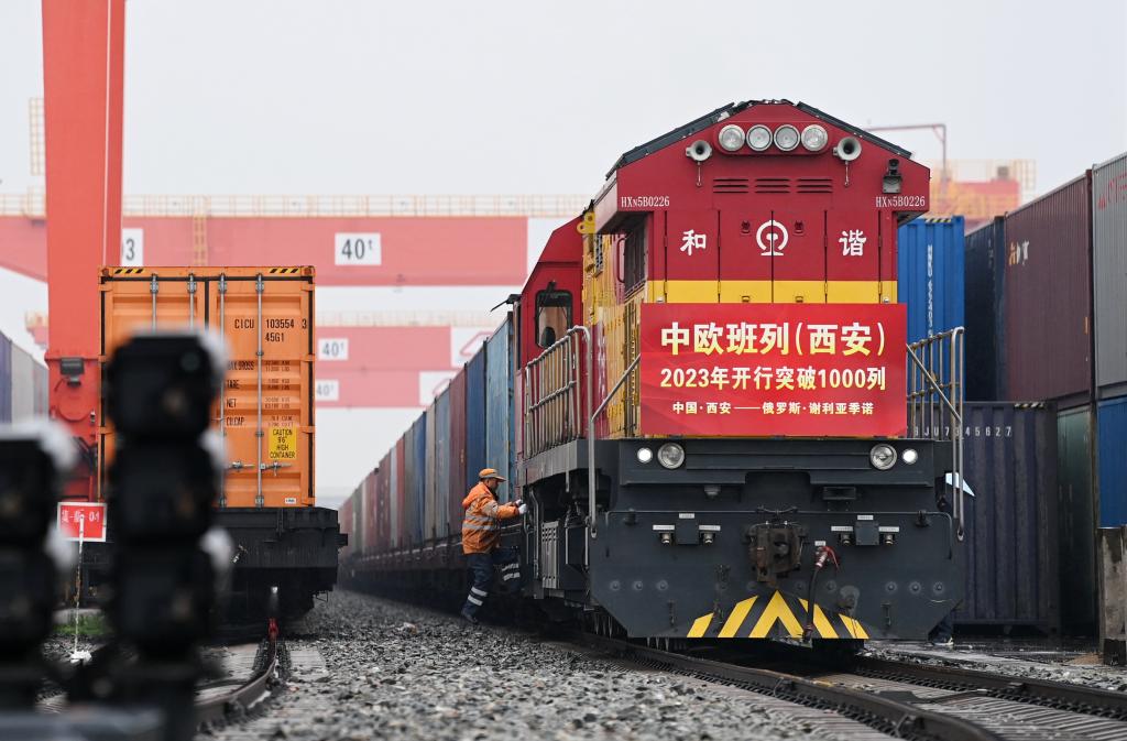 3月23日,在西安国际港站,X8489次中欧班列准备驶往俄罗斯谢利亚季诺。新华社记者李一博摄