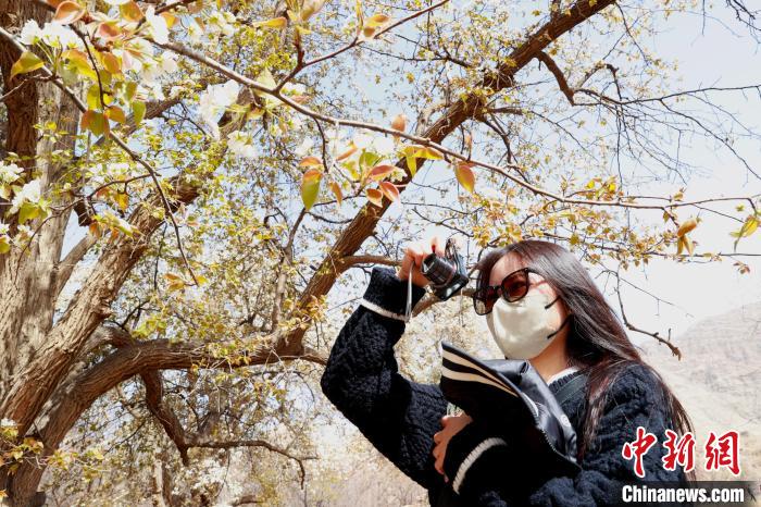 4月7日,游客在南长滩村拍摄梨花。于晶 摄