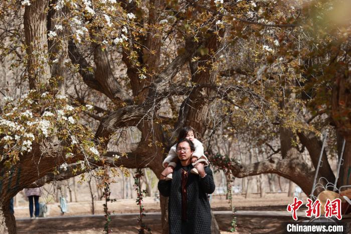 4月7日,一对父女在南长滩村赏梨花。于晶 摄