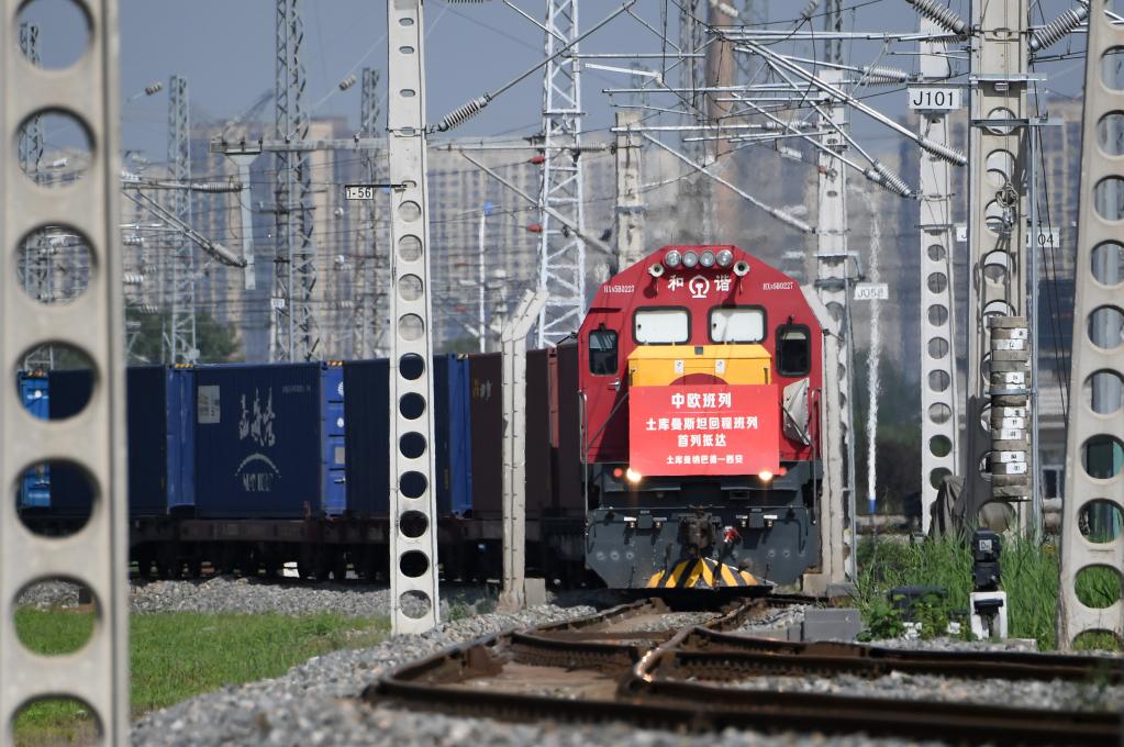 满载土库曼斯坦甘草中药材原料的中欧班列回程列车抵达西安国际港站(2022年8月31日摄,无人机照片)。 新华社记者李一博摄