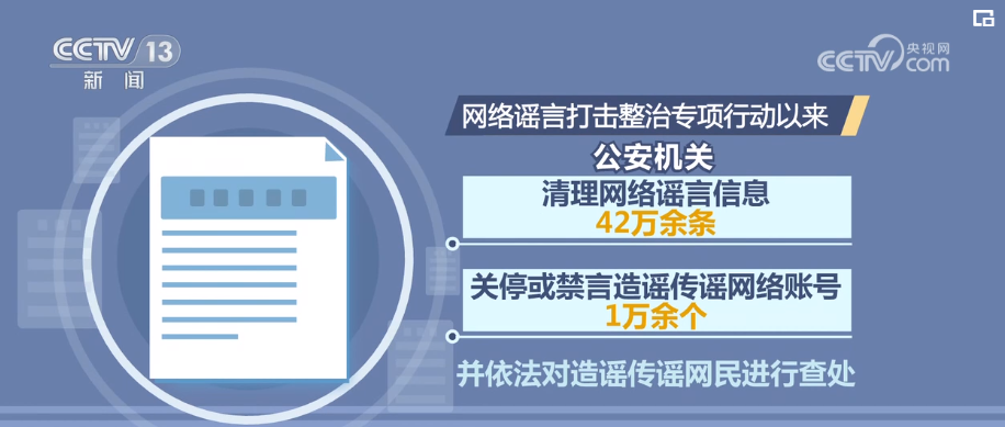 专项行动以来,公安机关清理网络谣言信息42万余条,关停或禁言造谣传谣网络账号1万余个,并依法对造谣传谣网民进行查处。