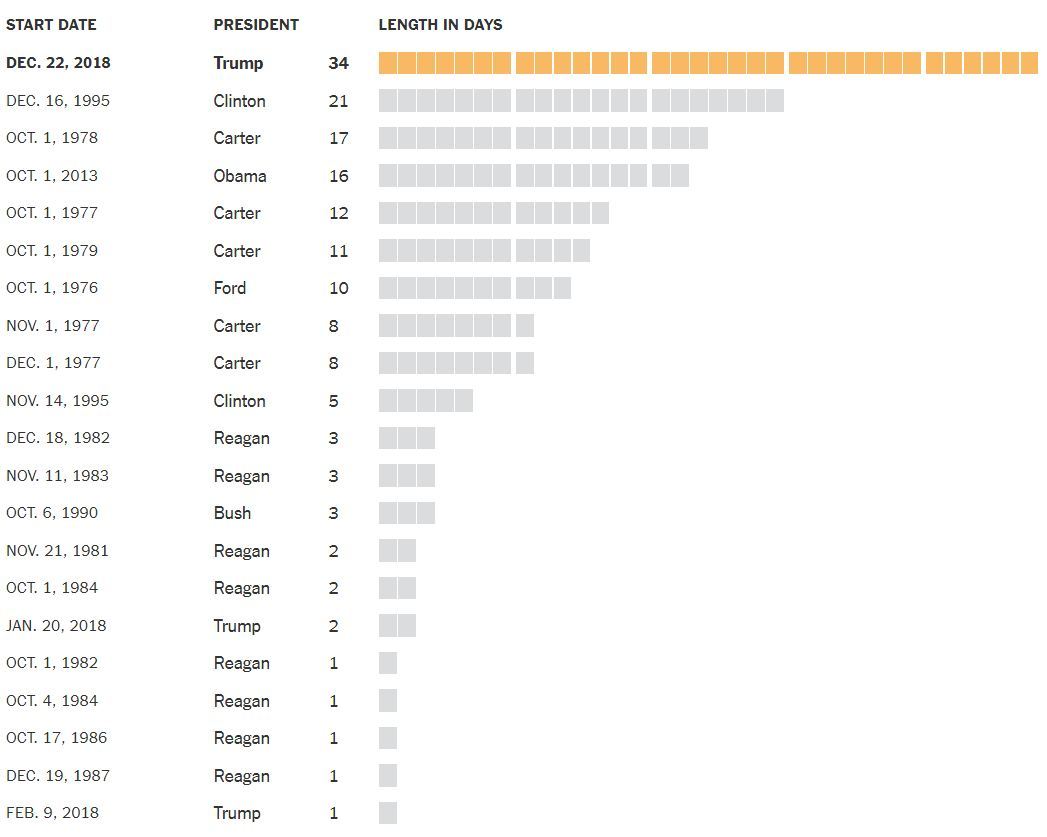 《纽约时报》列举了美国政府21次“停摆”的时间