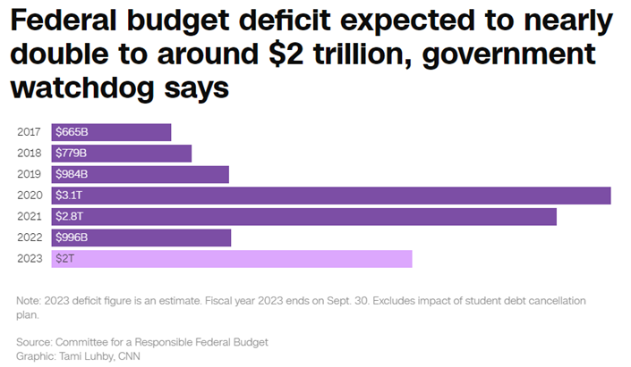 美国有线电视新闻网:据估算,在将于本月底结束的2023财年,美国联邦财政赤字或达到约2万亿美元,不仅较2022财年翻了一番,也远高于2024财年预算案中作为参照的赤字水平。