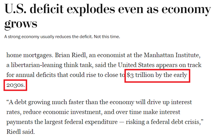 有分析人士认为,到本世纪30年代初,美国联邦赤字可能每年新增近3万亿美元,从而会推高利率,并逐渐使利息偿付成为美国政府最大支出款项,由此不断加剧债务炸弹引爆风险。
