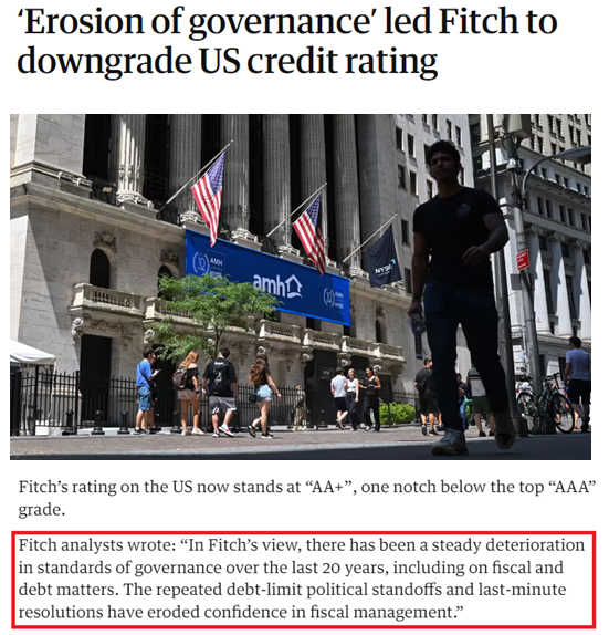 正如国际评级机构惠誉上月下调美国长期外币发行人违约评级后所说:“过去20年来,美国治理水平持续恶化,包括财政和债务问题。反复上演的债务上限政治僵局和最后一刻的解决方案,已经削弱了人们对美国财政管理的信心。”