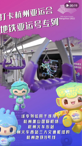 2023年5月16日,杭州地铁“亚运号”专列正式上线运行。目前,该专列运用于连接了杭州萧山国际机场、杭州火车东站、杭州火车西站三大交通枢纽的杭州地铁19号线,为杭州市民与海内外宾客展现流动的亚运风景线,点缀城市的亚运氛围。