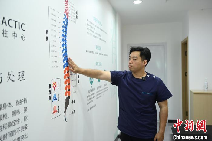 近日,来自台中的中医康复师简才皓在重庆从事脊柱相关的康复理疗工作。图为简才皓介绍自己的工作内容。