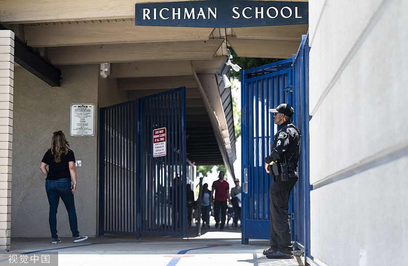 因校园枪击案频发,美国一所高中配备了警察。图源:视觉中国