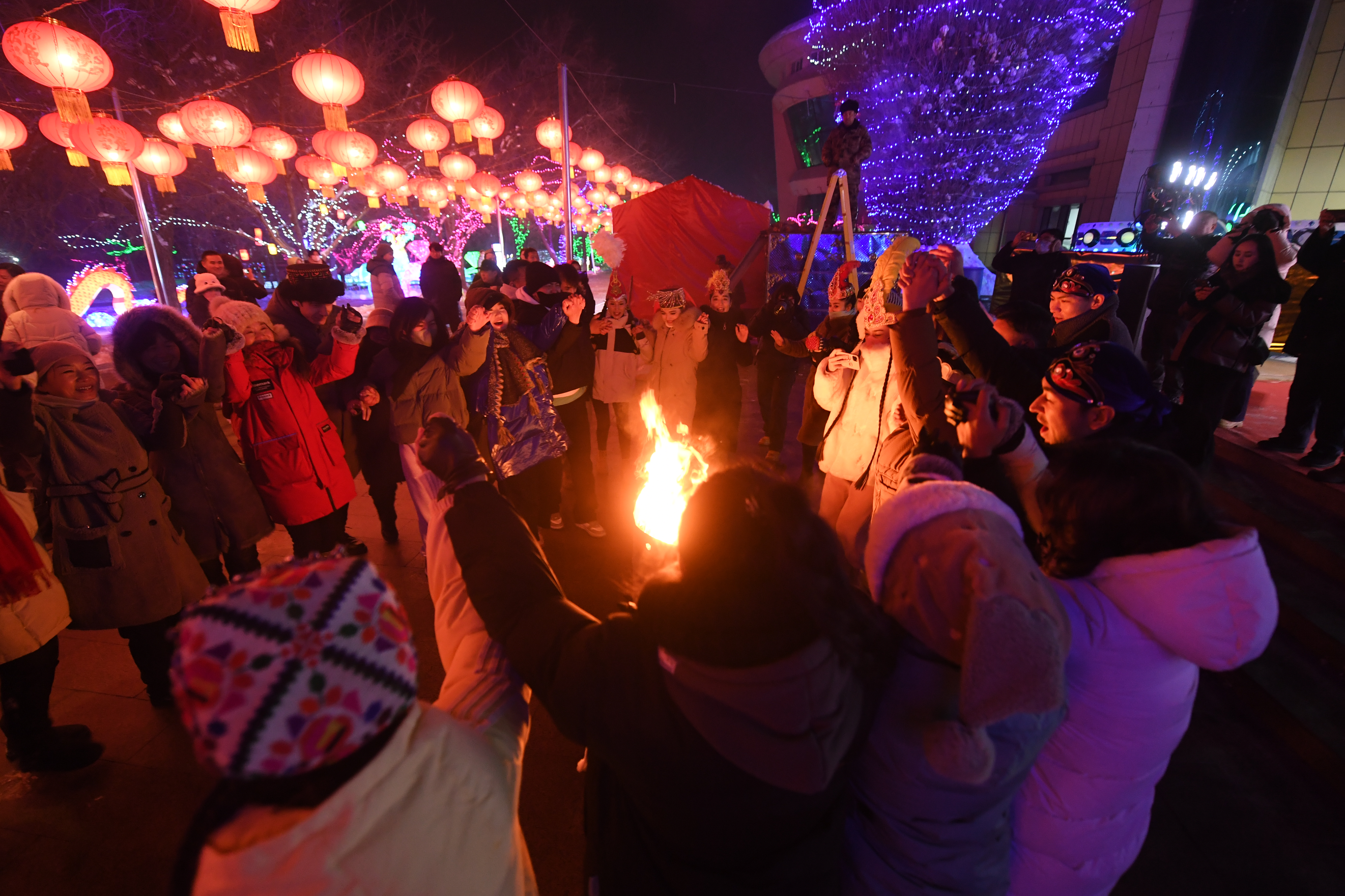 交汇点讯 晚上七点,“雪莲山梦幻冰雪节”现场一片欢乐。尽管户外气温零下13℃,体感温度还更低些,但人们还是聚集在点燃的篝火旁边,手拉着手,红色的火光照亮他们幸福的脸庞。