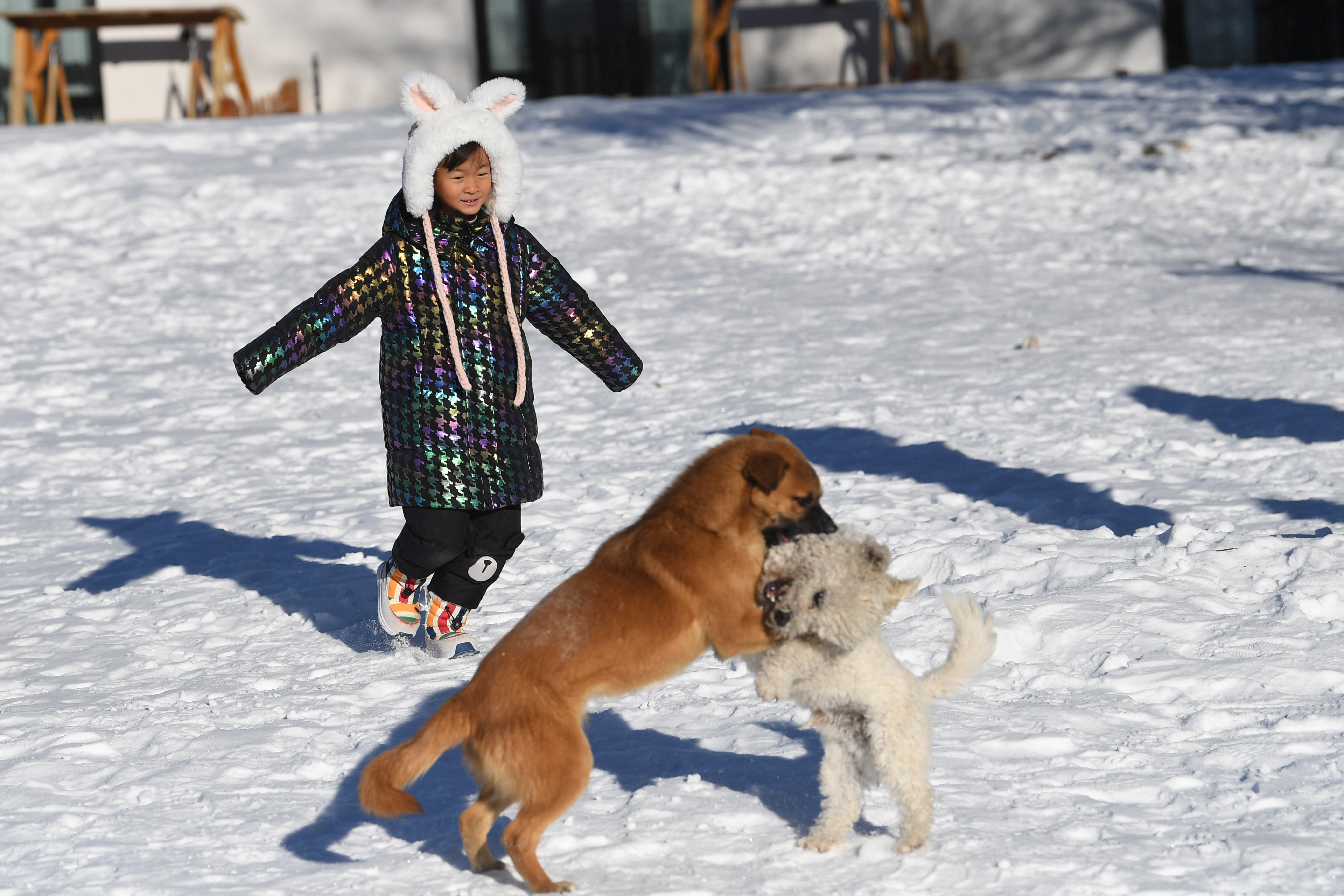 一名小游客正在民宿的院子里和两只小狗玩耍。“这里过去是垃圾场,打造成民宿后,不但增加了我们集体的收入,也改变了我们周边的环境卫生。”李桂琴说,接下来他们的目标是将平西梁村打造成全新疆民宿第一村。
