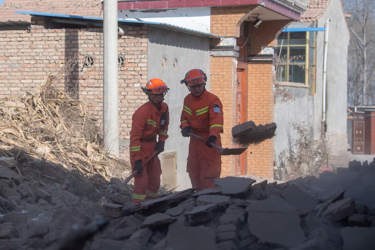 12月21日,在积石山县石塬镇石塬村,消防救援人员正在清理村中道路。人民网记者 翁奇羽摄