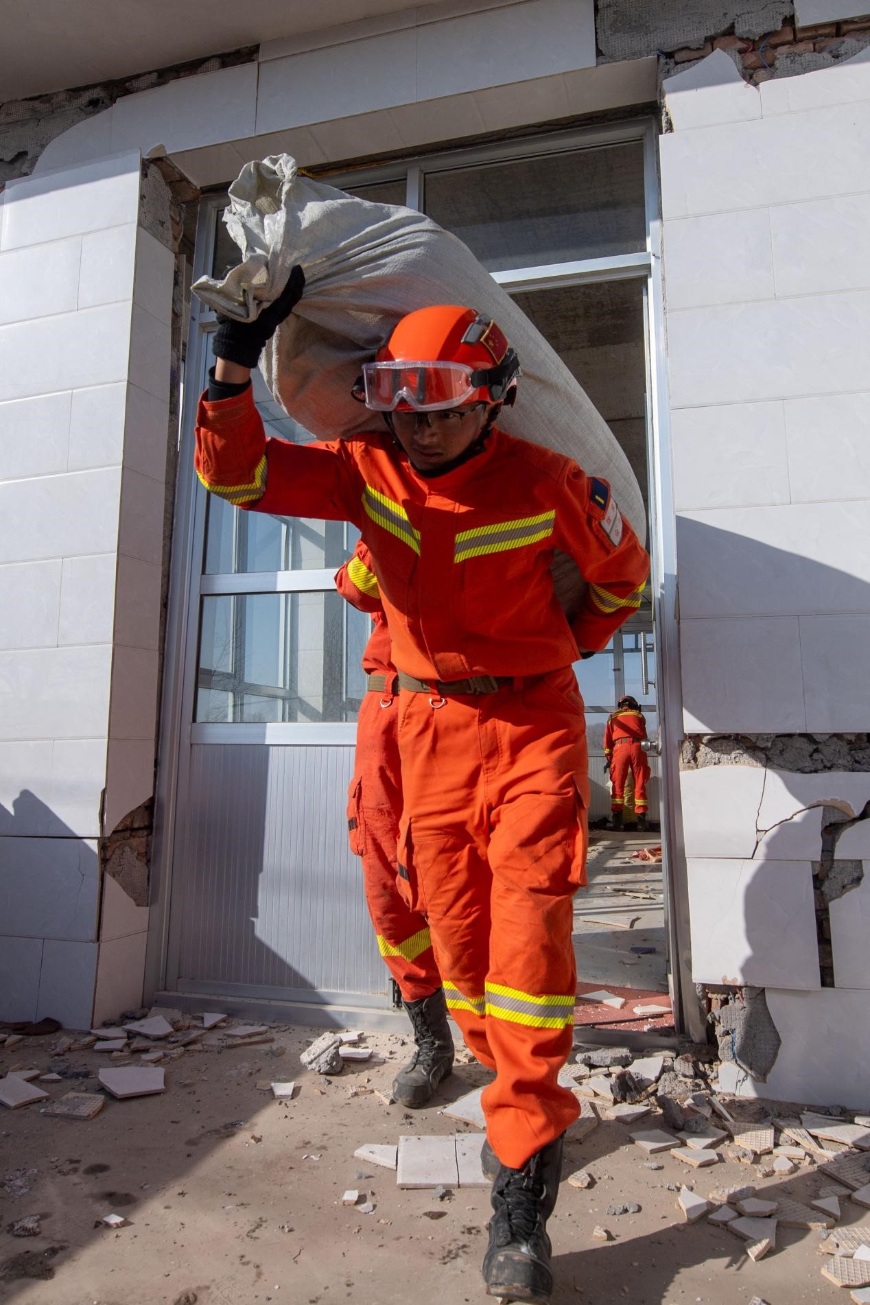 12月21日,在积石山县石塬镇石塬村,消防救援人员正在帮助群众转运物资。人民网记者 翁奇羽摄
