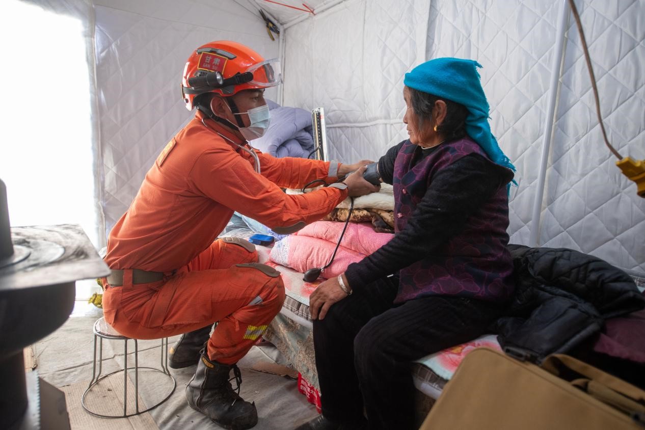 12月21日,在积石山县石塬镇石塬村安置点,消防救援队卫生员正在为身体不适的群众测量血压。人民网记者 翁奇羽摄