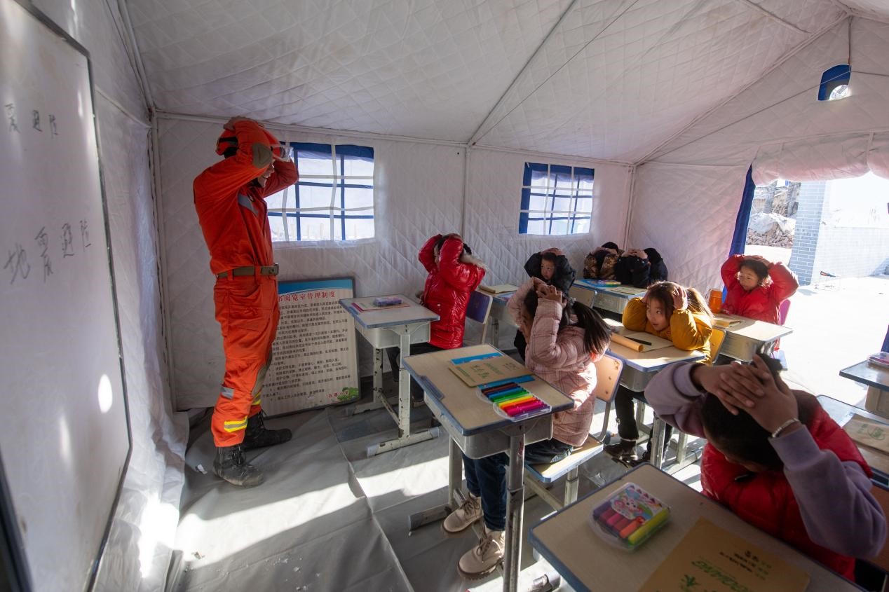 12月21日,在积石山县石塬镇石塬村安置点,消防救援人员正在给小学生们讲授地震避险常识。人民网记者 翁奇羽摄