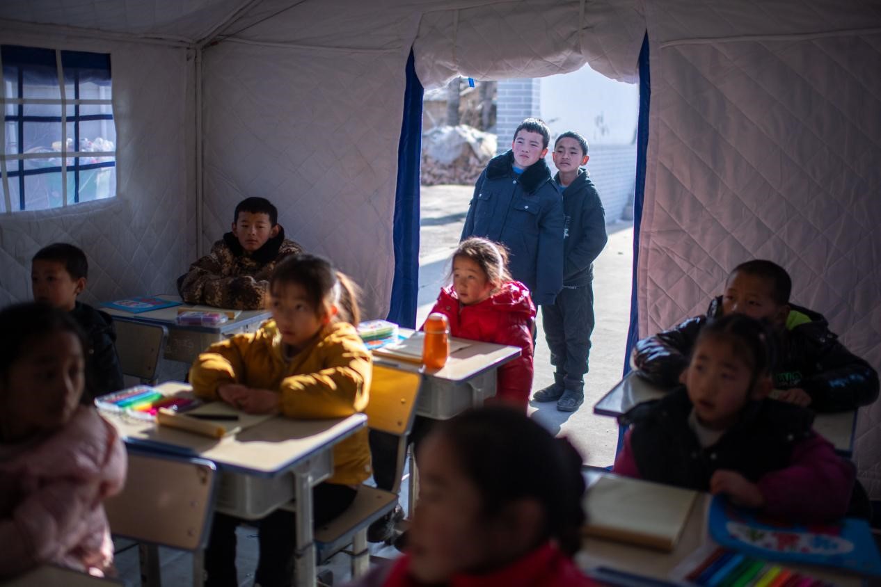 12月21日,在积石山县石塬镇石塬村安置点,地震避险科普小课堂吸引了不少小朋友前来听课学习。人民网记者 翁奇羽摄