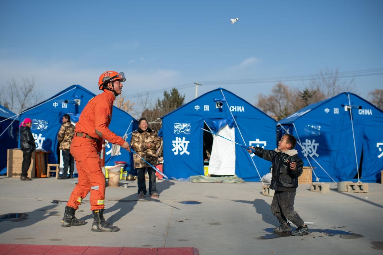 12月21日,在积石山县石塬镇石塬村安置点,消防救援人员忙里偷闲教小朋友打羽毛球。人民网记者 翁奇羽摄