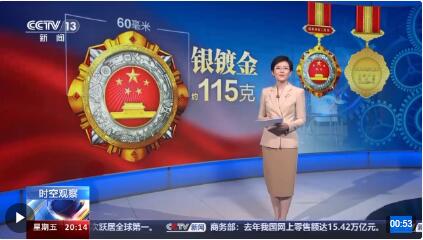 奖章通体直径为60毫米,采用了大家都很熟悉的红黄配色,材质为银镀金,重量约115克。整体是个国徽的形状,中间则是经典的五角星与天安门元素,象征国家级荣誉。