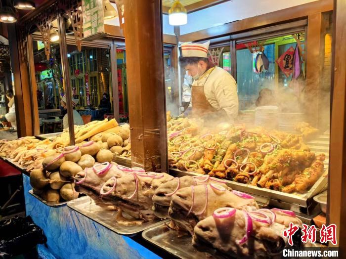 近日,努尔麦麦提·托合提准备好羊头、羊杂等新疆特色美食,以待顾客选购品尝。马晓东 摄