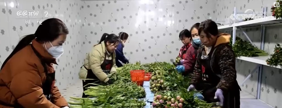 这段时间,位于菏泽市定陶区杜堂镇的种植基地迎来了芍药的销售旺季。温室大棚内,株株芍药亭亭玉立、含苞待放。切花工人穿梭于花田间,熟练地将芍药从植株上切下,第一时间送到分拣处,进行修枝、分级、脱蜜、包装、冷藏等工序,以保证切花的“鲜”度。