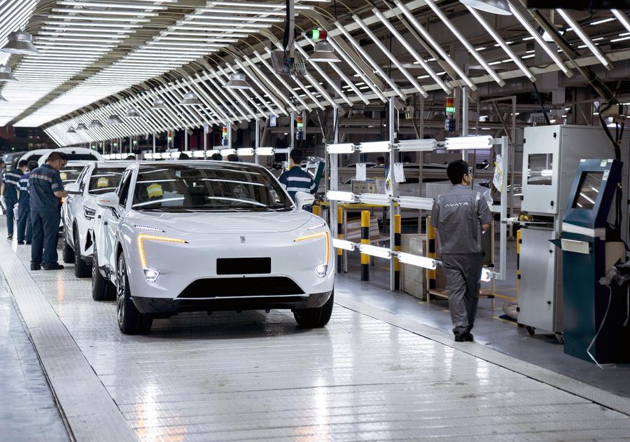 Workers are busy at a production line of the new energy vehicle AVATR at a workshop of Chang'an Auto in Jiangbei District, southwest China's Chongqing Municipality, July 20, 2023. (Xinhua/Li Qianlei)