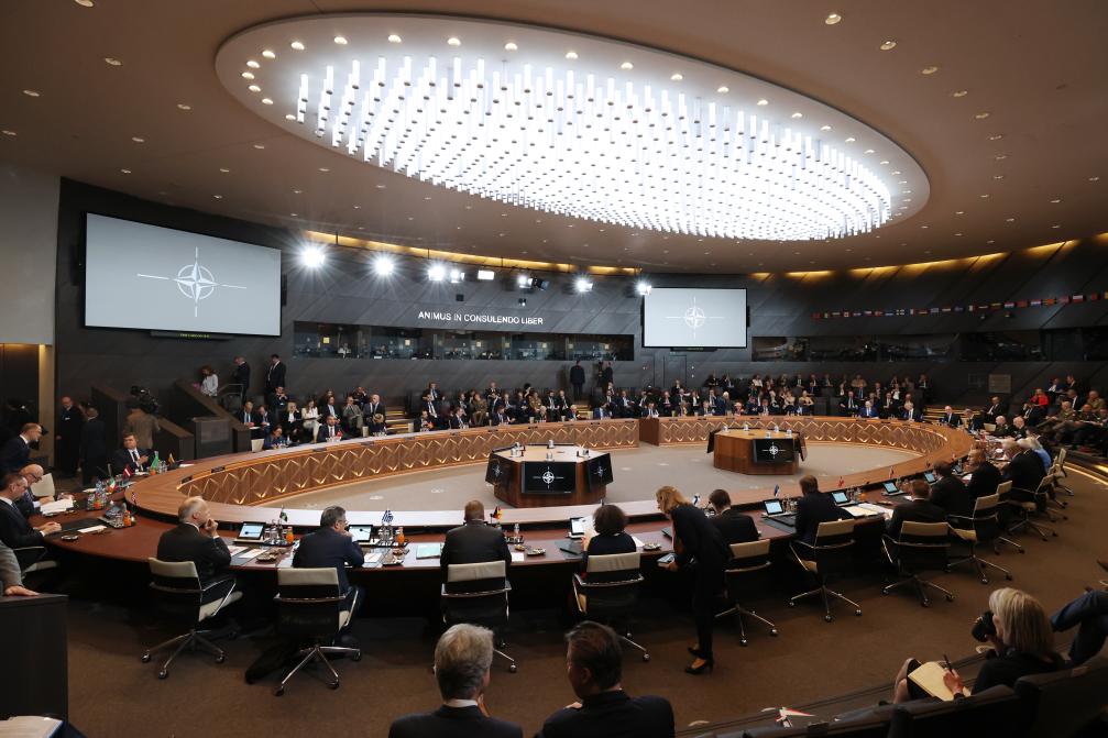 这是6月14日在比利时布鲁塞尔北约总部拍摄的北约防长会现场。新华社记者 赵丁喆 摄
