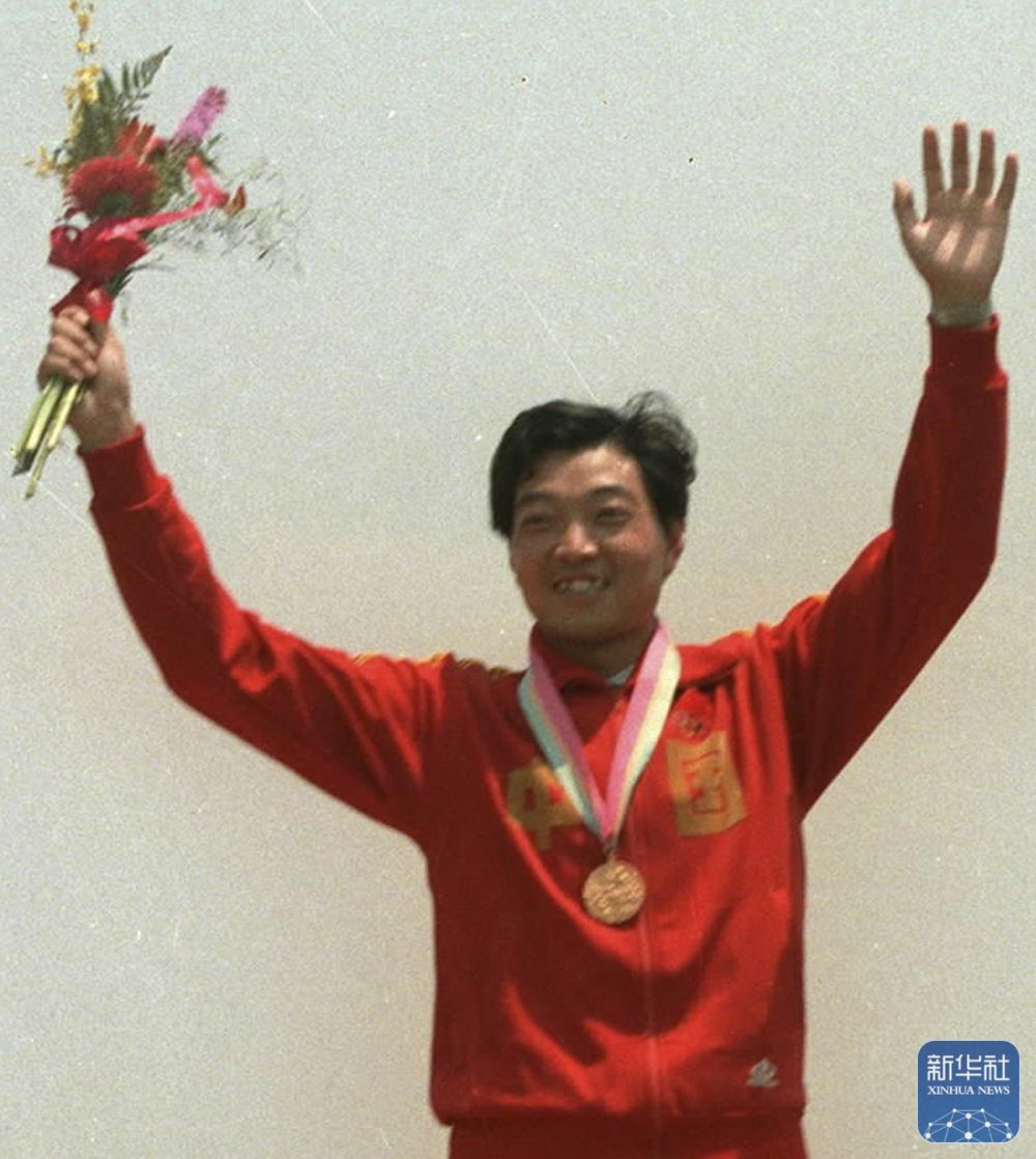 ↑1984年洛杉矶奥运会上,许海峰在获得男子自选手枪项目冠军后领奖(资料照片)。 新华社发