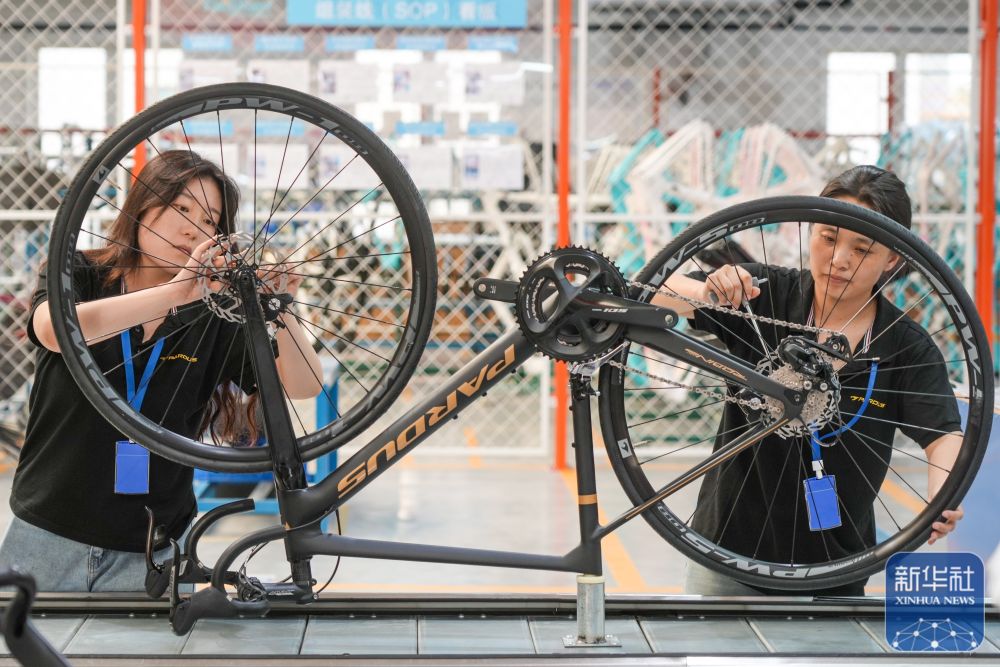 ↑ 2024年7月8日,在山东泰山瑞豹复合材料有限公司生产车间,工人在组装碳纤维自行车。位于山东乐陵经济开发区的泰山体育产业集团为2024巴黎奥运会的摔跤、自行车、跆拳道、体操、田径等比赛提供器材。新华社记者 朱峥摄
