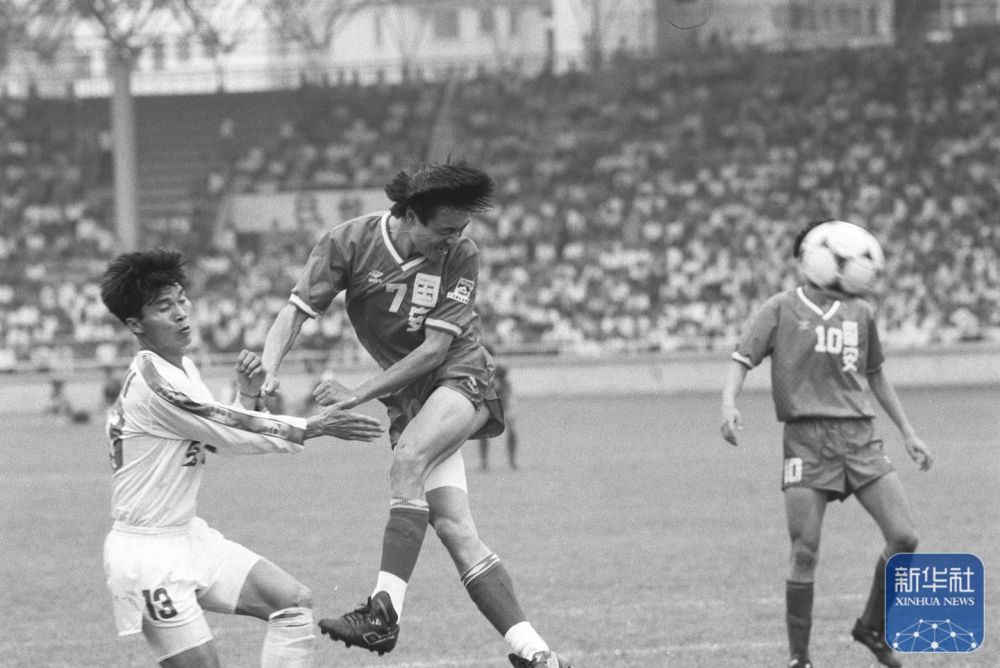 ↑1994是中国足球职业化改革元年。这是1994年4月17日,全国足球甲级联赛全面拉开战幕。广东宏远俱乐部队主场0比2负于北京国安俱乐部队,这是国安队7号谢峰(中)在头球攻门。 新华社记者 刘彦武摄