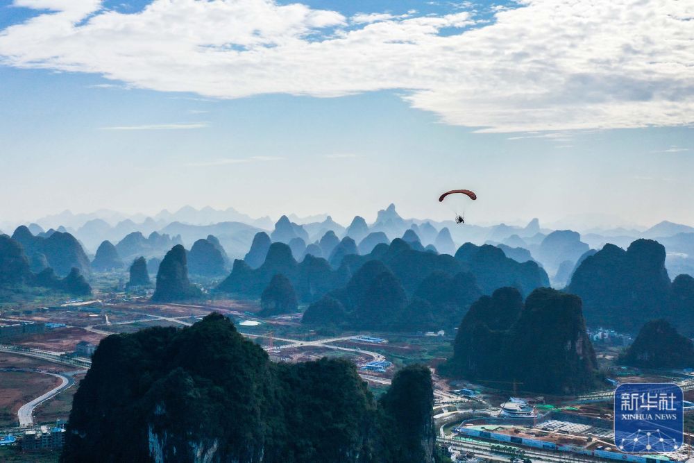 ↑游客在广西桂林市阳朔县体验动力滑翔伞(2019年11月14日摄,无人机照片)。 新华社记者 曹祎铭 摄