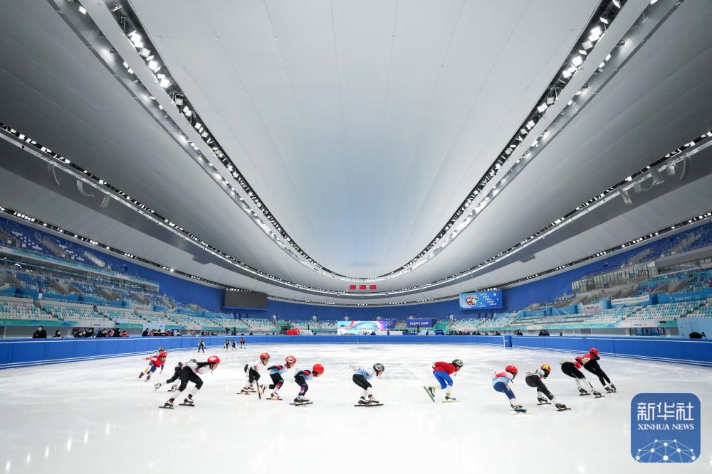↑ 2023年1月6日,小朋友们在国家速滑馆进行短道速滑训练展示。新华社记者 鞠焕宗摄