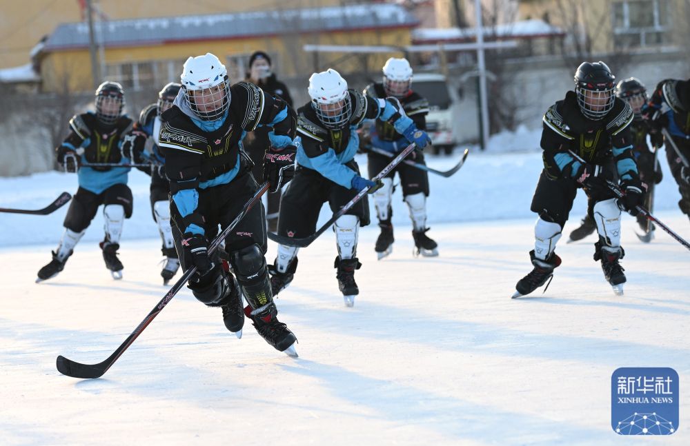 ↑乌鲁木齐县水西沟中学冰球队在训练(2023年12月20日摄)。 新华社记者 李贺 摄