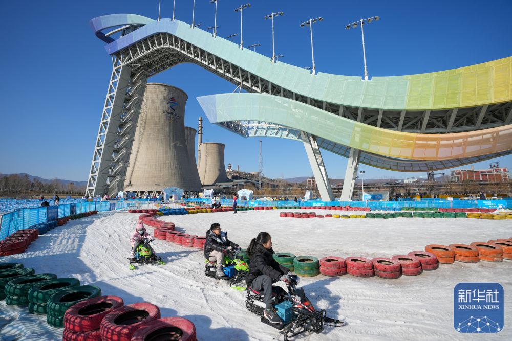 ↑游客在首钢滑雪大跳台下的“首钢园冰雪汇”体验雪上游乐项目(2023年1月31日摄)。 新华社记者 鞠焕宗 摄