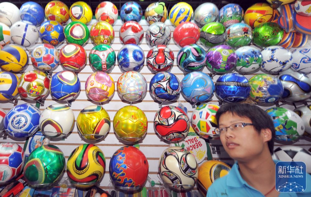 ↑2010年6月23日,一位顾客正在浙江义乌小商品市场内选购足球。据义乌海关统计,受南非世界杯带动,当地体育用品的月度出口额连续半年超过1000万美元,2010年前5个月的出口额比前一年同期增长110%。 新华社记者 王定昶摄