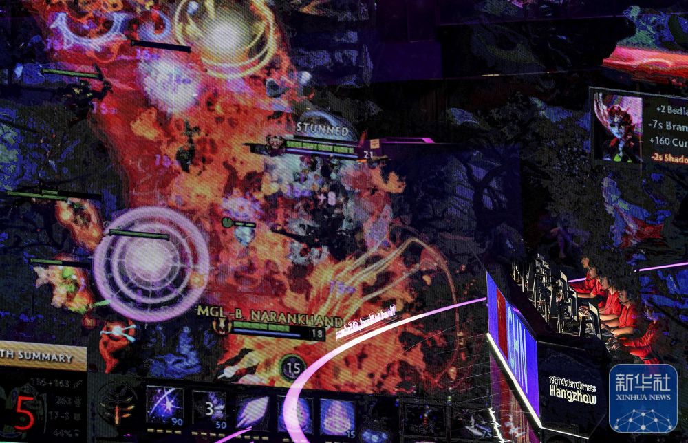 ↑2023年10月2日,中国队选手在比赛中(多重曝光照片)。 当日,在杭州亚运会电子竞技项目刀塔决赛中,中国队以2比1战胜蒙古国队,获得冠军。 新华社记者 颜麟蕴 摄