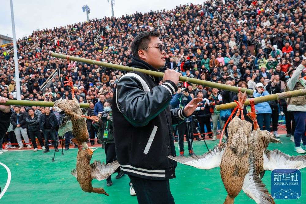 ↑2023年3月27日,村民挑着当地农特产品“三穗麻鸭”进入赛场。这是季军铜仁市代表队的奖品。 当日,贵州省首届“美丽乡村”篮球联赛总决赛在黔东南州台江县台盘村举行。新华社记者 欧东衢 摄