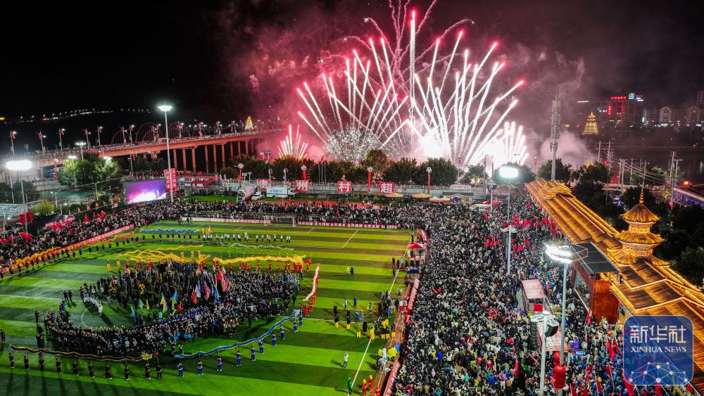 ↑2024年2月3日,音乐烟花秀在“村晚”上演(无人机照片)。当日,2024全国“村晚”示范展示活动暨贵州“村超村晚”在贵州省黔东南苗族侗族自治州榕江县拉开帷幕。活动包括“村超村晚”文艺展示、2024龙年“村超”贺岁战等内容。新华社记者刘续摄