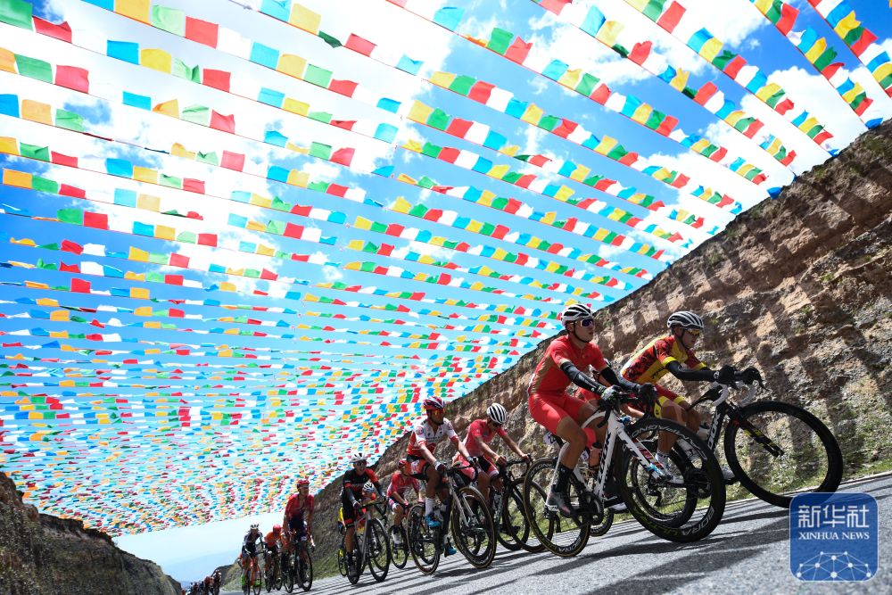 ↑2022年7月29日,参赛选手在比赛中骑行。 当日,第二十一届环青海湖国际公路自行车赛进行了第三赛段贵德至共和的角逐。 新华社记者 张龙 摄