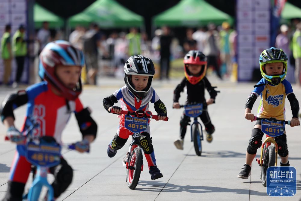 ↑2024年6月22日小选手寒博赟(左二)在比赛中骑行。当日,2024甘肃省儿童平衡车童车联赛在甘肃省兰州市甘肃大剧院广场开赛。新华社记者 陈斌 摄