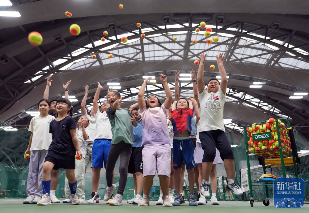 ↑2024年8月14日,在北京一家网球俱乐部,小学员在结束网球暑期夏令营的课程后合影。 新华社记者 才扬 摄