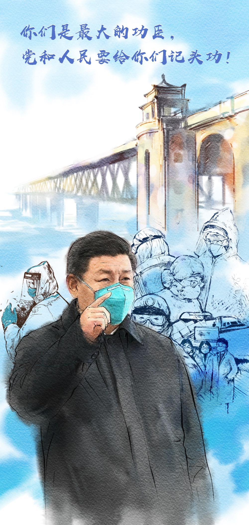 “你们是最大的功臣,党和人民要给你们记头功!”决战疫情的关键时刻,习近平总书记亲赴武汉,向第一线的战“疫”者送去党中央的关怀与慰问。一个多月以来,以医务工作者为代表的抗疫斗士舍生忘死、逆行出征,为战“疫”赢得转机。致敬用生命守护人民的英雄,有你们在,战“疫”必胜!